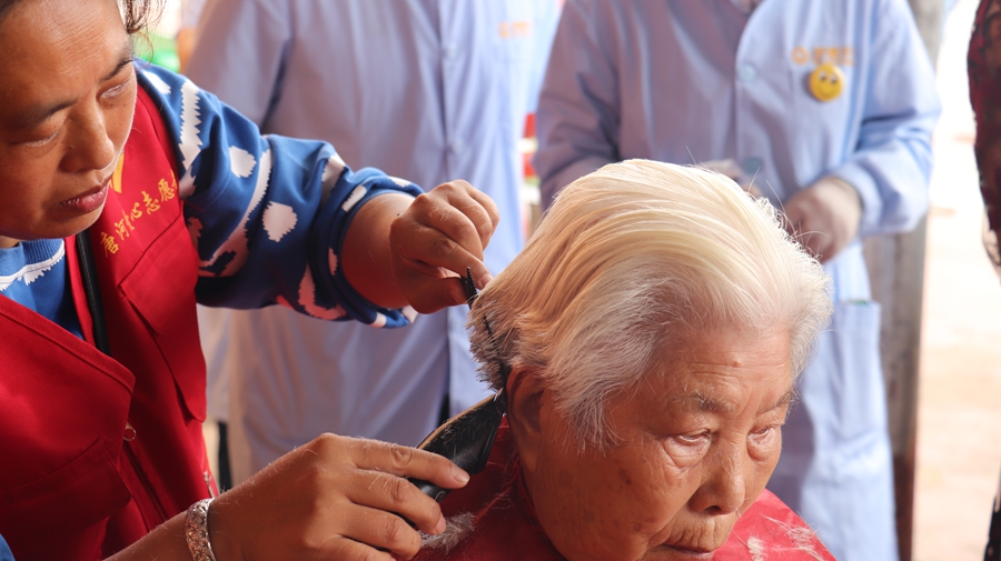 10月10日,爱心志愿者在唐河县滨河街道为老年人修剪头发。
