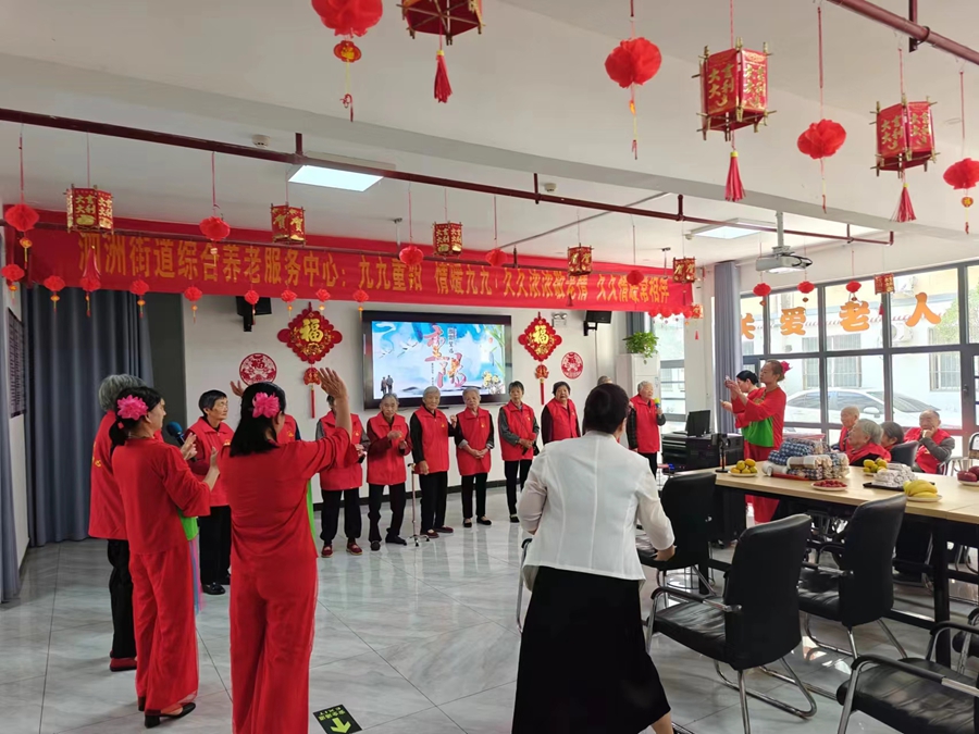 10月11日,唐河县泗洲街道综合养老服务中心的工作人员在为老年人过重阳节。