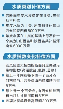 在水质类别补偿方面,若断面年度水质稳定在Ⅱ类,三省互不补偿;年度水质为Ⅰ类,河南省共补偿山西省和陕西省6000万元;年度水质在Ⅱ类的基础上每恶化一个类别,山西省和陕西省共补偿河南省6000万元。