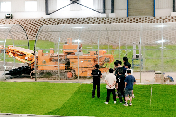目光投向远处,一片绿意盎然的草坪上,十几个学生正簇拥在老师身旁,学习掘进机的操作。只见老师轻轻推动摇杆,掘进机便如同被唤醒的钢铁巨兽,缓缓启动,履带平稳地向前滚动。